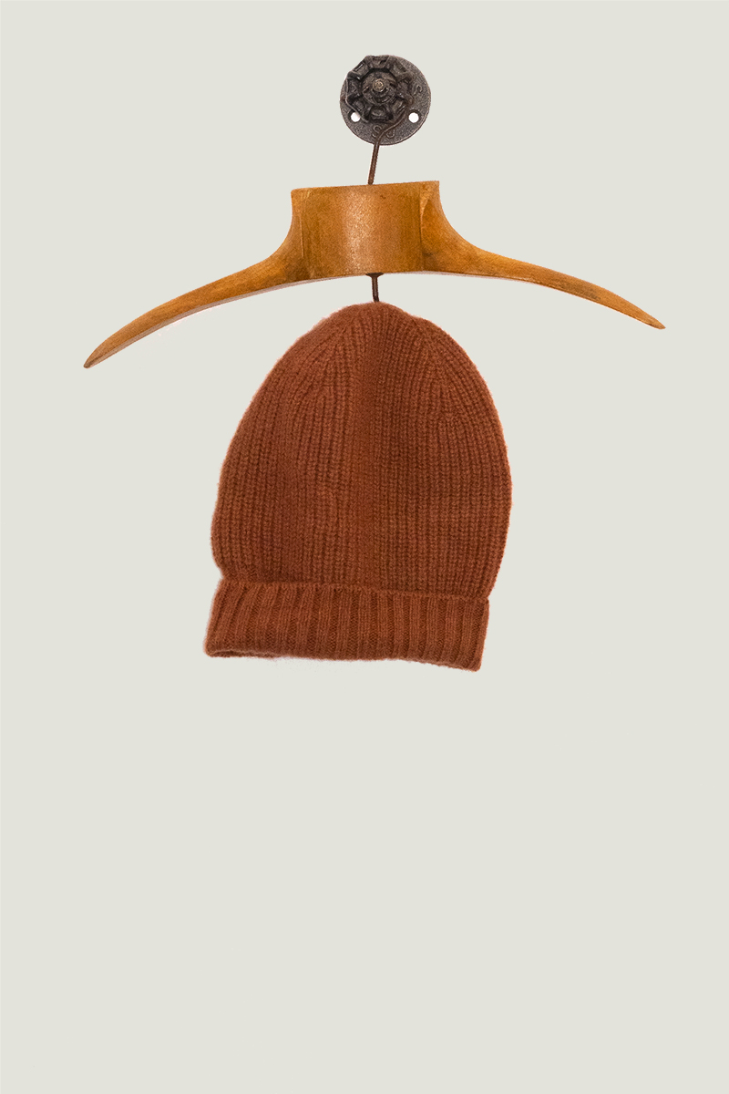Bonnet en mérinos d'Arles français, filé et tricoté en France. Cote anglaise retournée. Hauteur revers plié : 23 cm. Hauteur du revers : 6 cm. Édition très limitée. Teinture végétale artisanale à la garance.